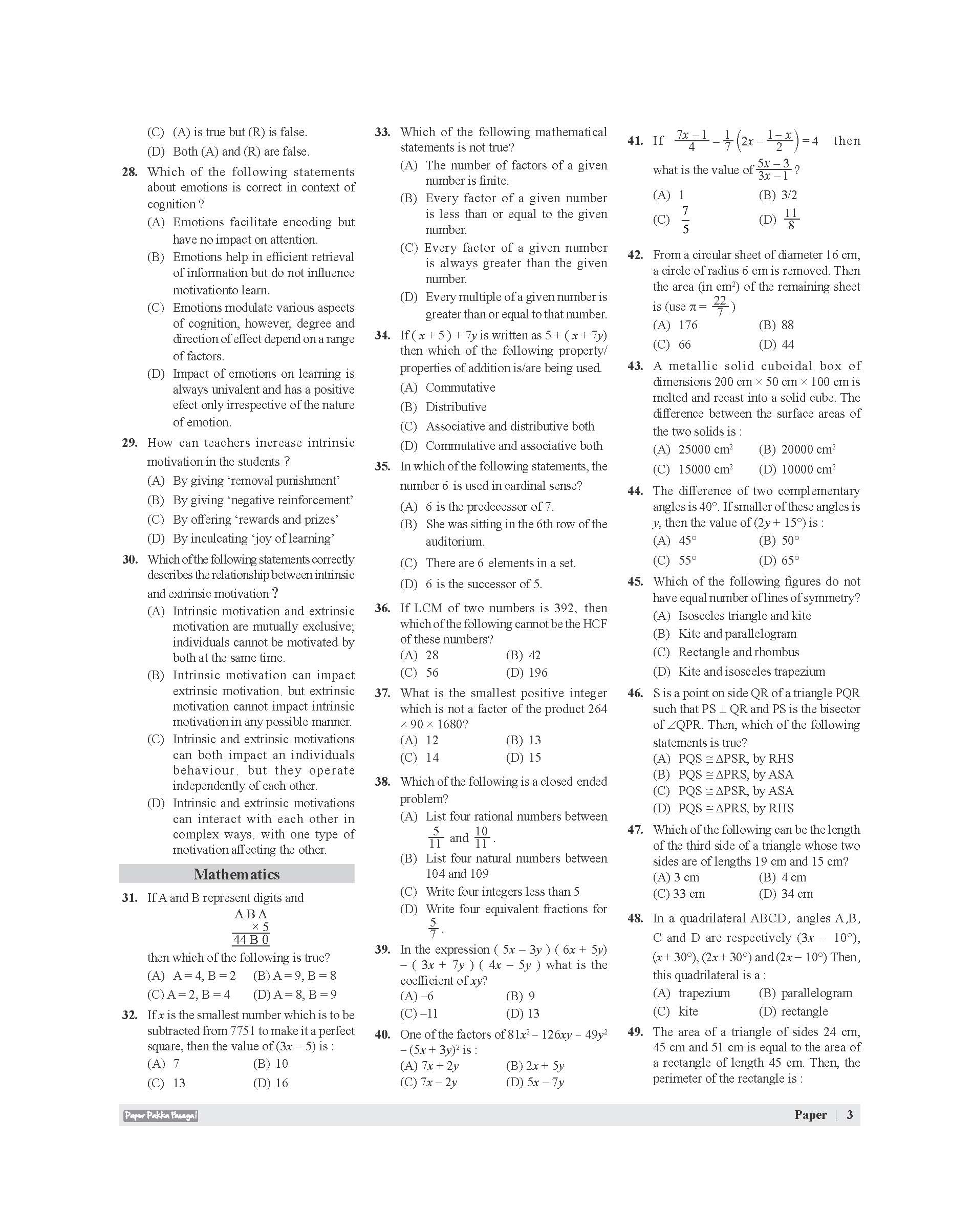 Q3. Which subjects are covered in the CTET Paper-2?
