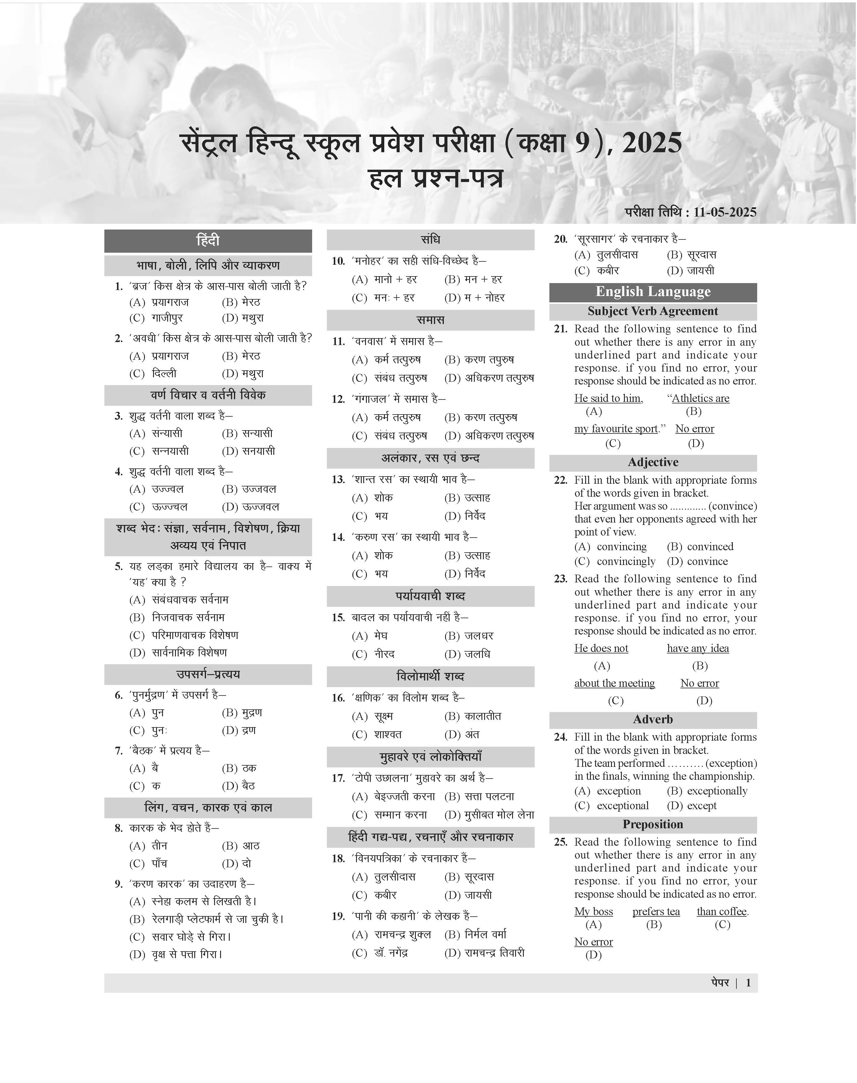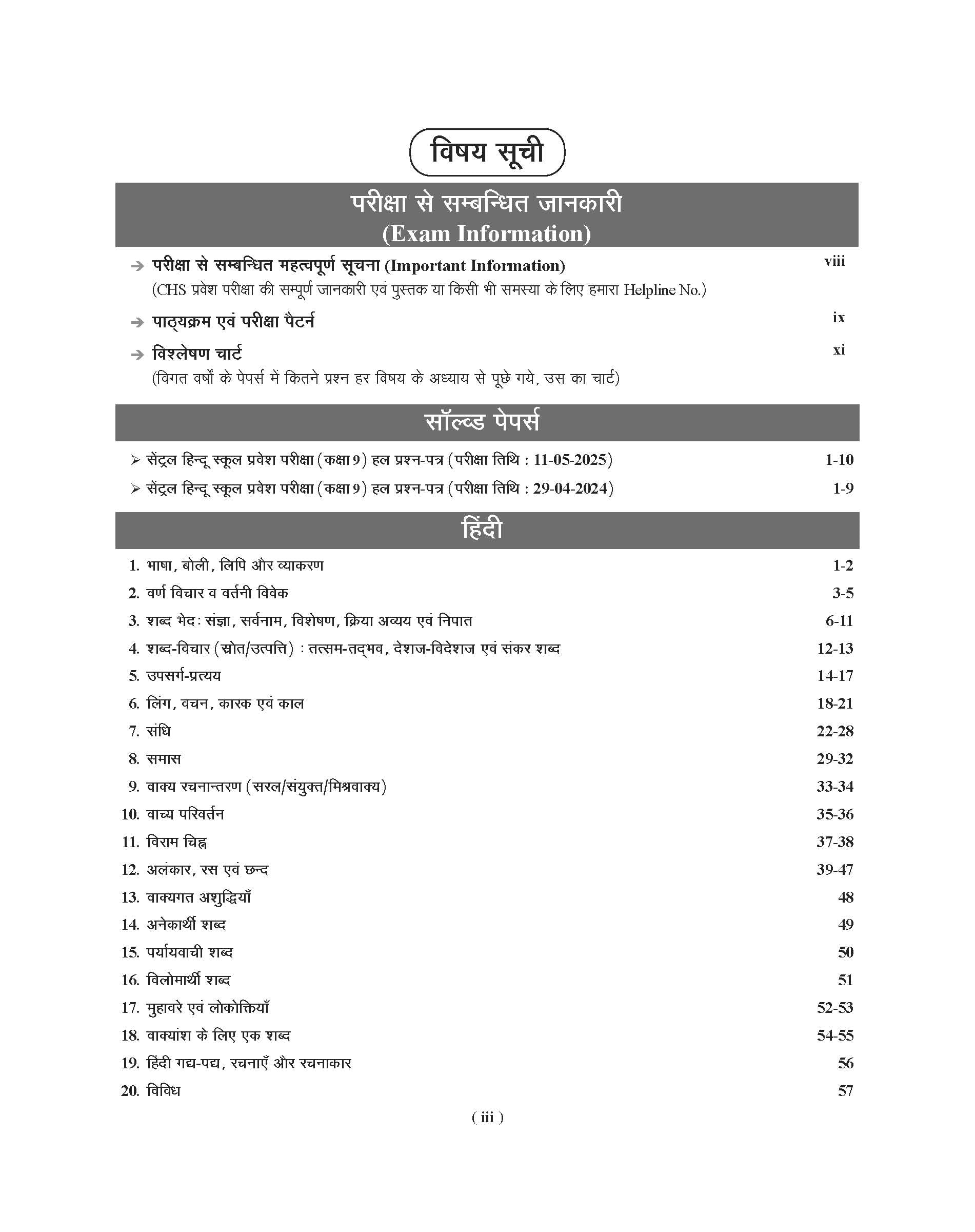 Book Structure of Central Hindu School (CHS) Entrance Exam 2025 Class 9 in Hindi